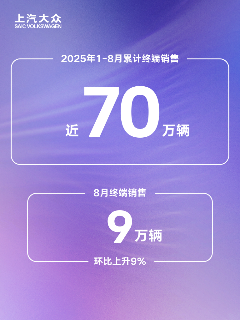 8月,上汽大众终端销售9万辆,环比上升9%,今年1-8月累计终端销量近70万辆。
